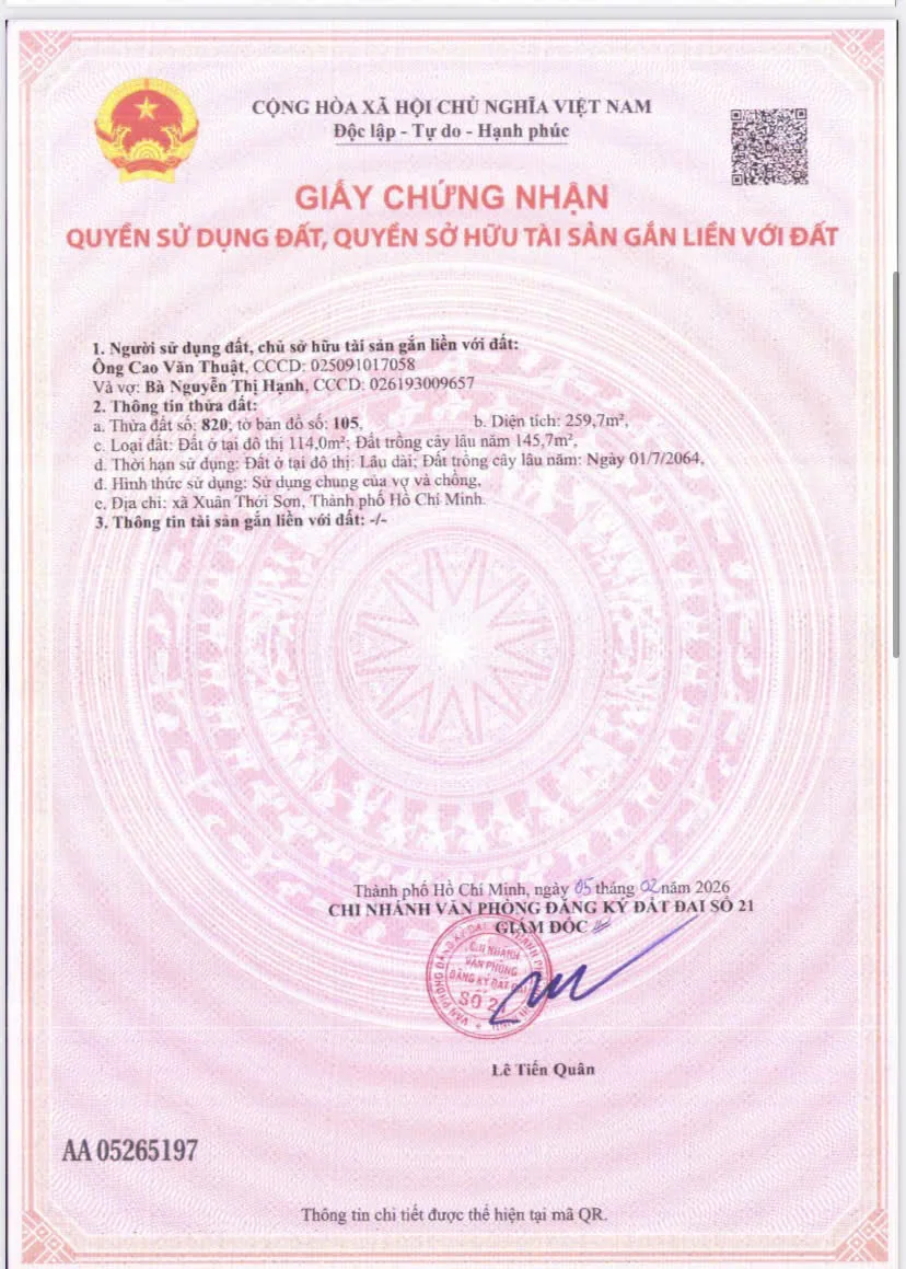 - Diện tích: 260m2 (trong đó có 114m2 thổ cư và 145,7m2 đất trồng cây)