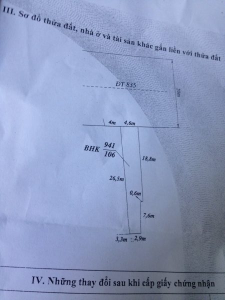 - Diên tích: 106 m2, phần mặt tiền rộng 4,5m dài 26,5m, phần đuôi phía sau rộng 3m, dài 7,5m
